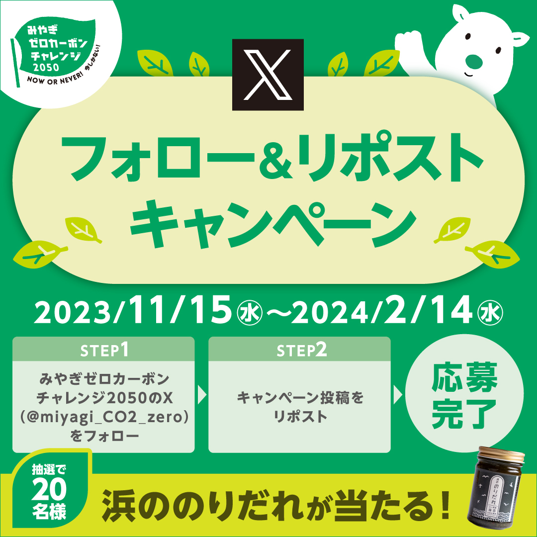 みやぎゼロカーボンチャレンジ2050の公式Xアカウント(@miyagi_CO2_zero)をフォローして、対象のポストをリポストしよう!
