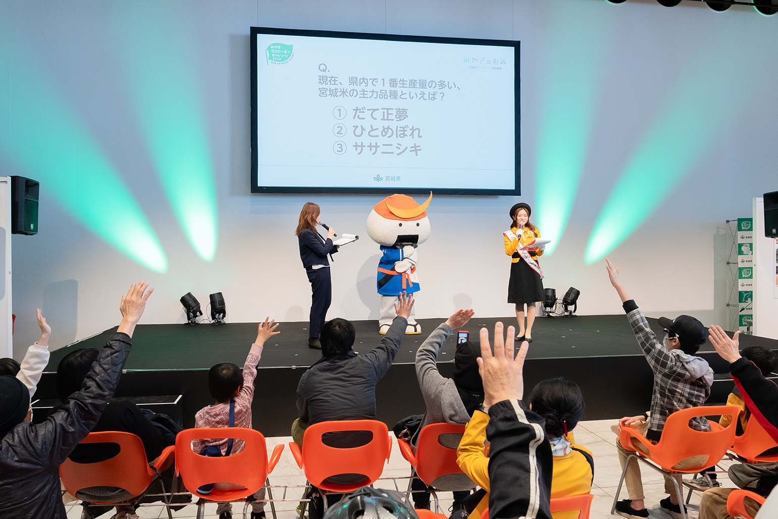 宮城米PRキャラクターのみやぎライシーレディに宮城のお米や環境保全米について紹介いただきました。最後には、クイズ形式で振り返り、お子様から大人まで多くの皆様に御参加いただきました。