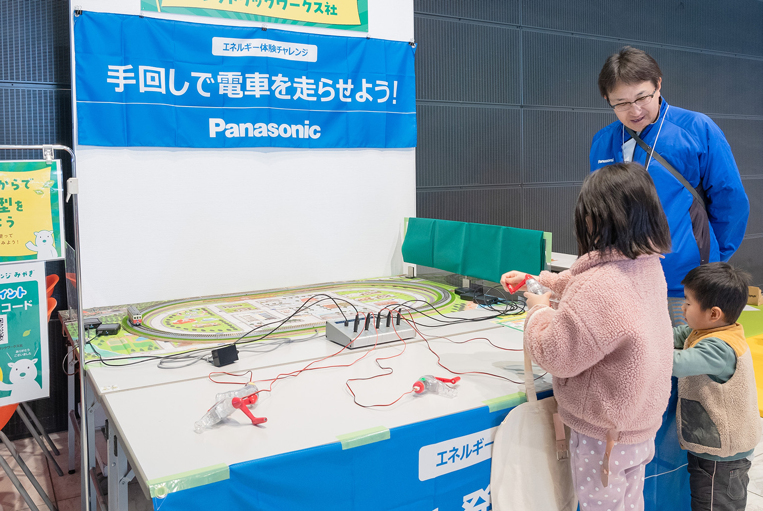 手回し発電機を使って電車模型を動かす体験ブース。お子様を中心に、多くの方に参加いただきました。