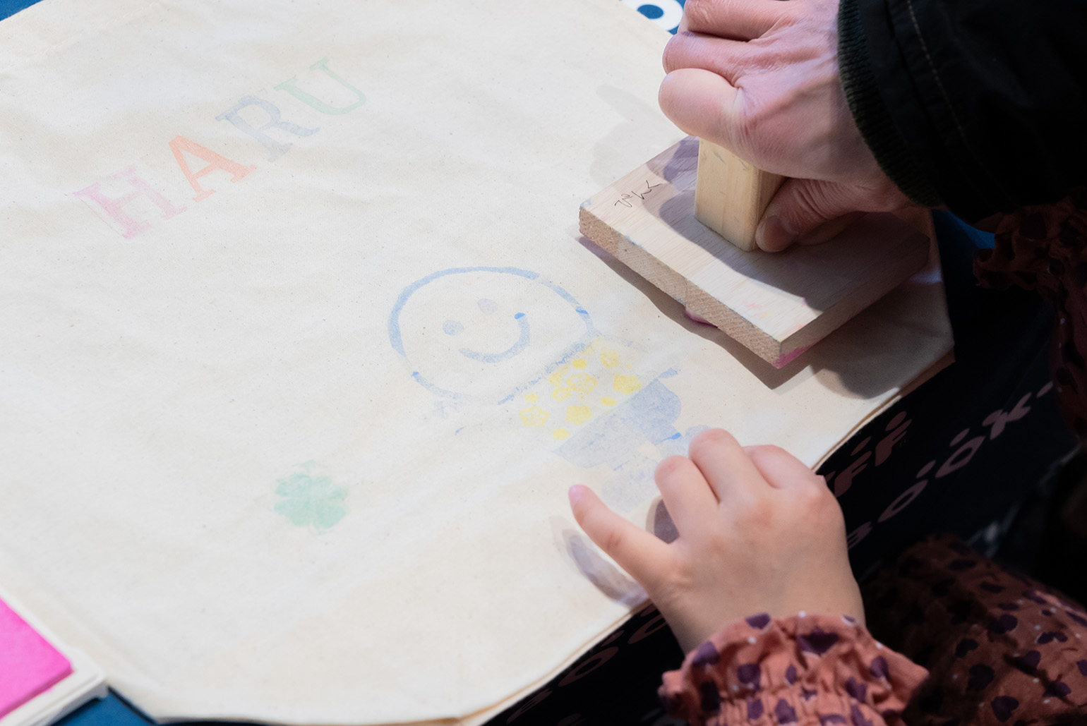 ブックオフのオリジナルキャラクター・よむよむ君のスタンプを使ったエコバックづくりができる体験ブース。名前やよむよむ君のスタンプを使ってオリジナルのマイバッグづくりを楽しんでいただきました。
