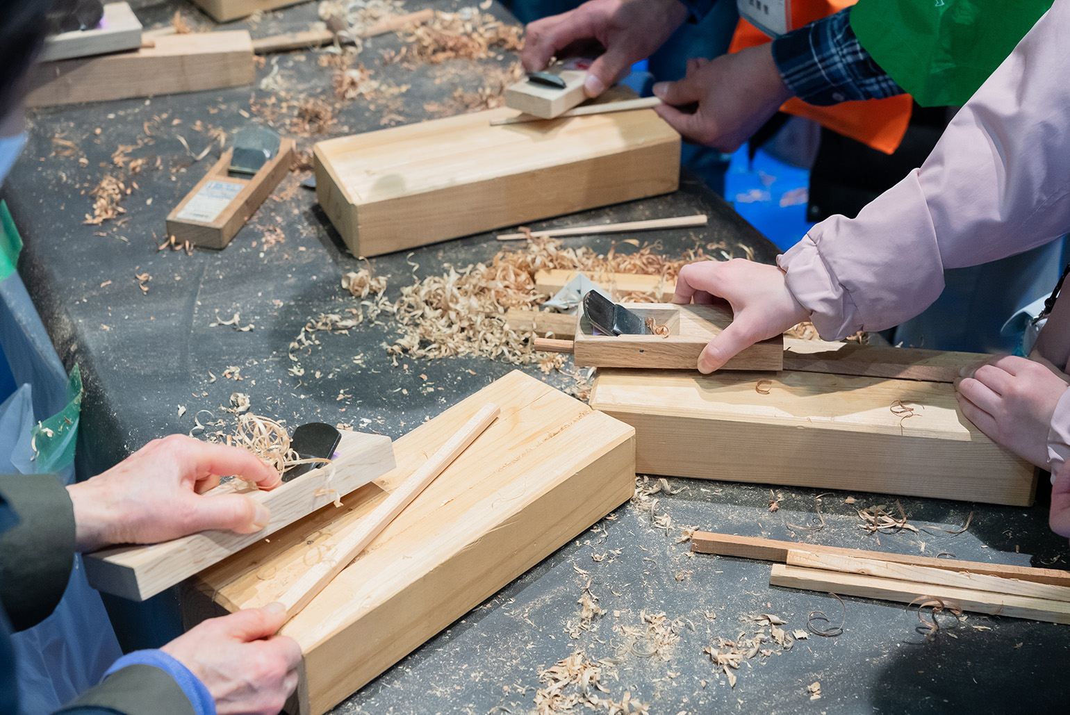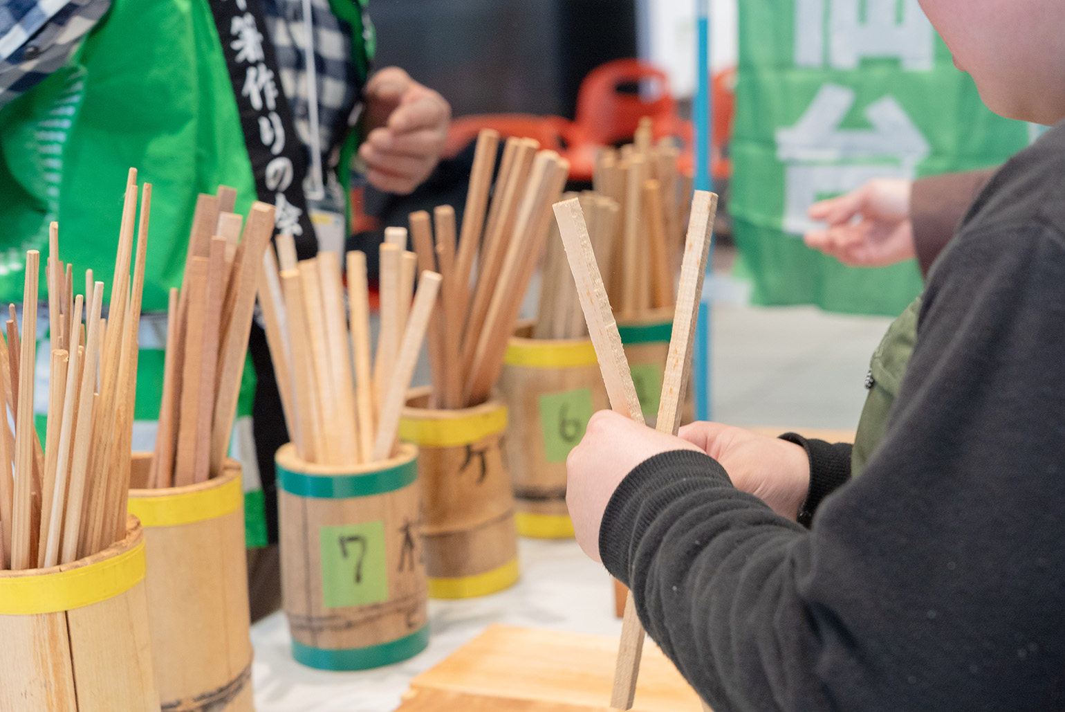 ゴミの削減等につながるマイ箸づくりができる体験ブース。沢山の方に、樹種を選んでお好みの箸をつくっていただきました。