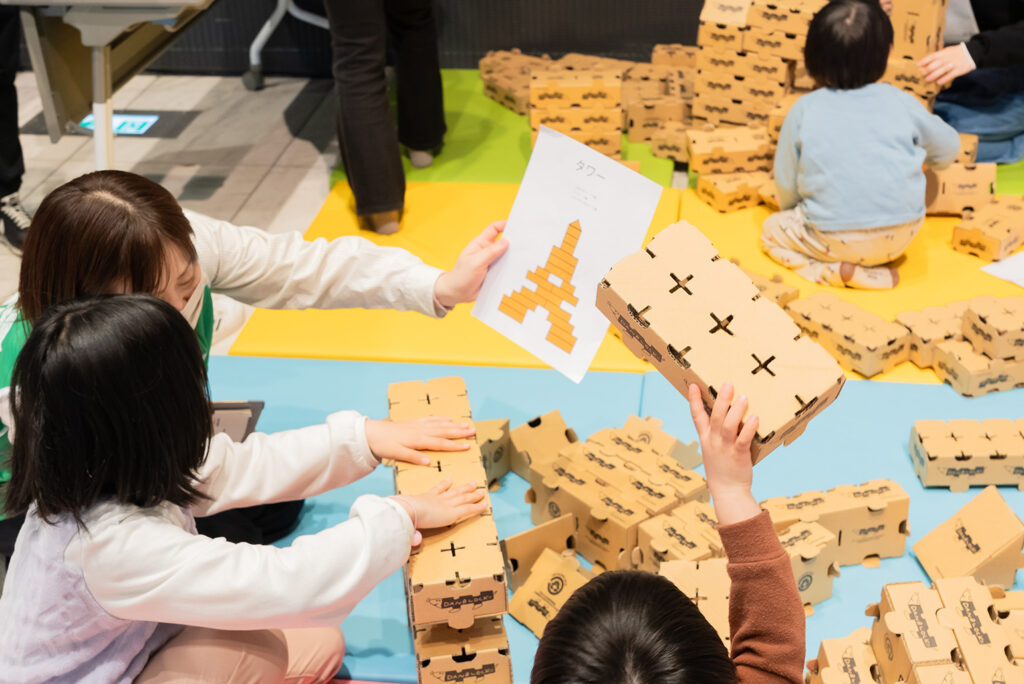 キッズコーナーでは、段ボールでできた安全でエコなブロック「段ブロック」で、多くの子どもたちが楽しく遊んでいました。