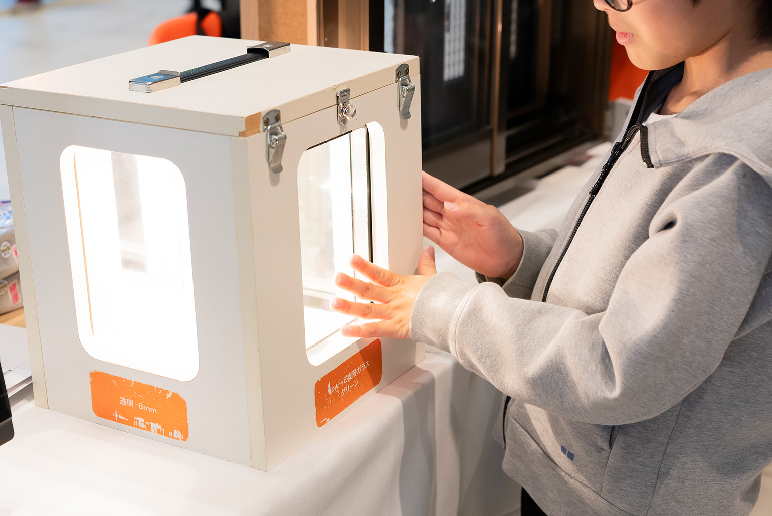 窓ガラスに手を当てて温度差を実際に体感できる展示コーナー。ガラスの種類や内窓の有無によって体感温度の違いを感じていただき、断熱改修による効果を実感していただきました。